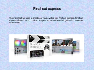The document discusses a music video production that uses unconventional forms and conventions to tell a narrative story. It challenges typical music video styles by not including lip syncing or appearances by the artist. Instead, it uses actors to portray a story that reflects the song's lyrics about a man waiting for his love. Camera shots and mise-en-scene techniques help convey the storyline and emotions. Audience feedback found the narrative video to be appropriate and entertaining, showing the unconventional approach was successful.