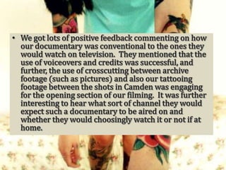 This documentary aims to create an artistic narrative about issues of human interest related to tattoos. Conventional documentary techniques like interviews, establishing shots, subtitles, and voiceovers are used. Audience feedback was positive about the engaging style that used crosscutting between footage and pictures. The documentary is intended to appeal to a target audience aged 14-25.
