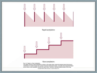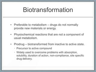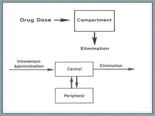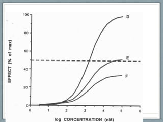 Pharmacodynamics is the study of how drugs act on biological systems and their mechanisms of action. Drugs can interact with receptors to mimic or block physiological messengers. Agonists activate receptors while antagonists reduce or prevent agonist effects. Receptors are often proteins that drugs bind to through covalent, ionic, or hydrogen bonds. Signaling mechanisms involve ligand-gated ion channels, G-protein coupled receptors, and second messengers such as cAMP or calcium ions. Understanding these interactions is important for elucidating drug actions at the cellular level.
