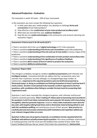 The document provides guidance for a 20-mark evaluation assignment consisting of four questions about a media production project. It must address how the media product used or challenged conventions; the effectiveness of combining the main product with ancillary texts; what was learned from audience feedback; and how media technologies were used in various stages. The assessment criteria evaluate skills in technology use, understanding of forms and conventions, role of new media, audience feedback, and ability to communicate. According to examiners, stronger evaluations combined analysis with presentation and fully addressed all questions in the most appropriate format, while weaker ones were brief, presented as essays, or did not properly answer questions.