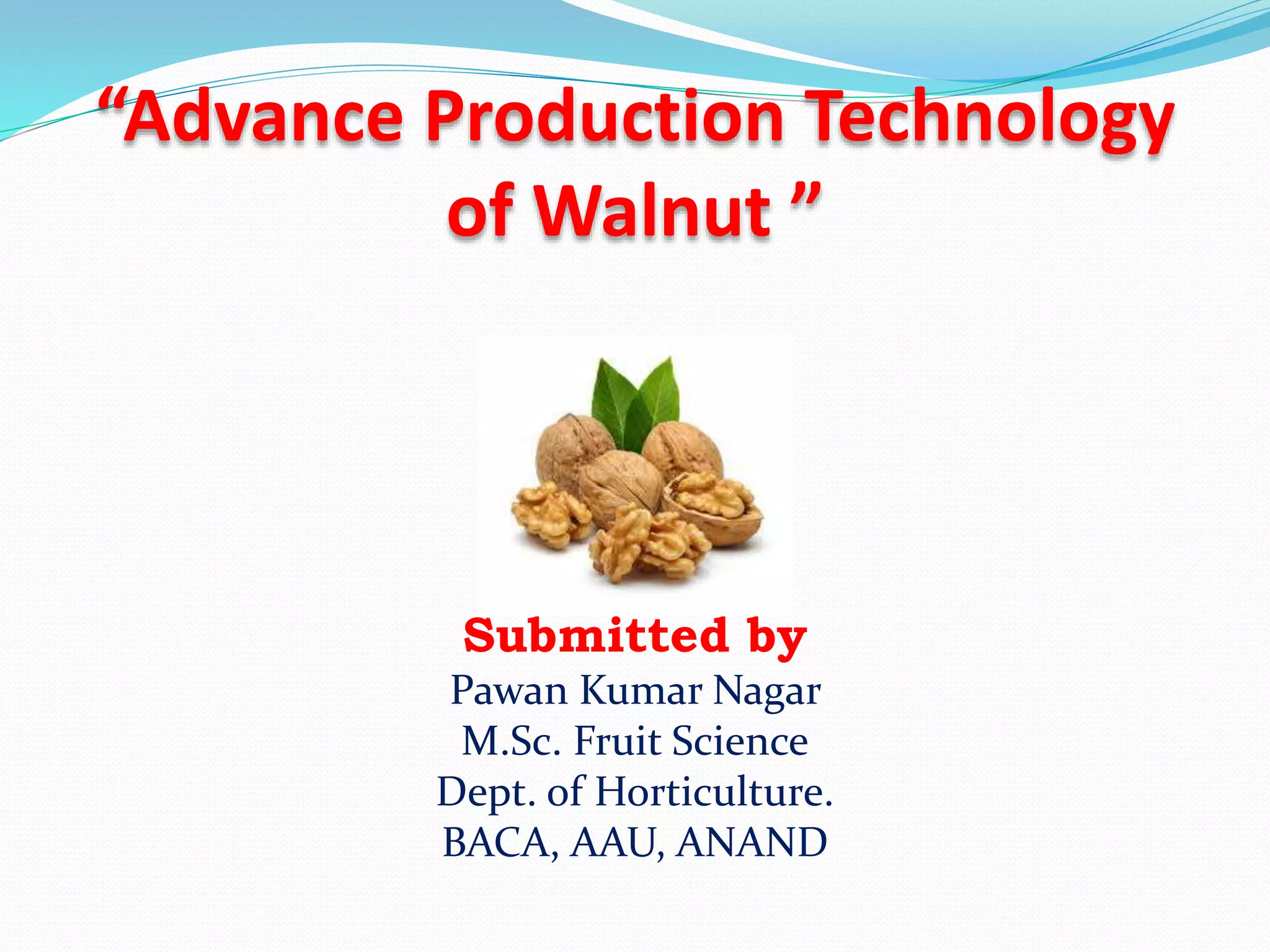 This document provides an overview of walnut production technology. It discusses the botany and taxonomy of walnut trees, describes important varieties, and outlines recommendations for propagation, cultivation, training, fertilization and pest management of walnut orchards. Key points include that walnuts are best propagated through grafting or budding, have a modified central leader training system, require specific climate and soil conditions, and are monoecious trees that rely on cross-pollination.