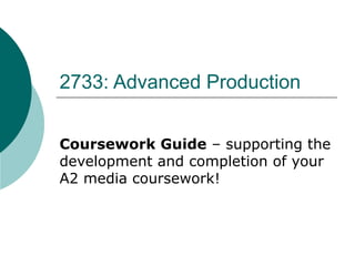 The document provides guidance for students completing an advanced media production coursework. It outlines the requirements for maintaining a blog to document the planning, production, and evaluation process. Students must produce 2 advertisements or 2-3 minutes of a music video by February 13th and have the final projects completed by March 13th. The evaluation section requires students to reflect on the production process, analyze the finished products, and evaluate audience response and how the projects compare to similar real media.