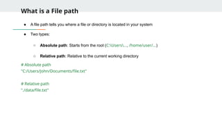 ○ Absolute path: Starts from the root (C:Users..., /home/user/...)