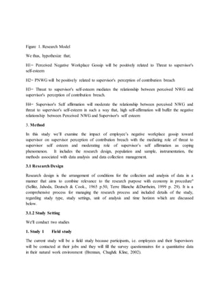 This document discusses a study examining the impact of negative workplace gossip by employees about their supervisor on the supervisor's perception of a psychological contract breach. It proposes that negative gossip threatens the supervisor's self-esteem, leading to perceived breach of the implicit obligations between employee and supervisor. The study will test whether self-affirmation by supervisors can reduce this effect by buffering threats to self-esteem. It outlines hypotheses, a research model, and methodology including field and experimental studies to collect data from supervisors and employees to test the relationships between negative gossip, self-esteem, perceived breach, and the moderating role of self-affirmation.