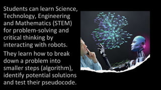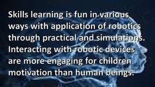 The document discusses the use of Maya software and robotics in education. Maya is a 3D modeling and animation software that can be used to create realistic robot kinetics and dynamics through its modeling, animation, and programming tools. Robotics in education serves as an interactive teaching tool to engage students, facilitate educational activities, and promote learning through one-on-one instruction and personalized learning experiences. Designing and building robots also helps develop creativity, collaboration, and communication skills.