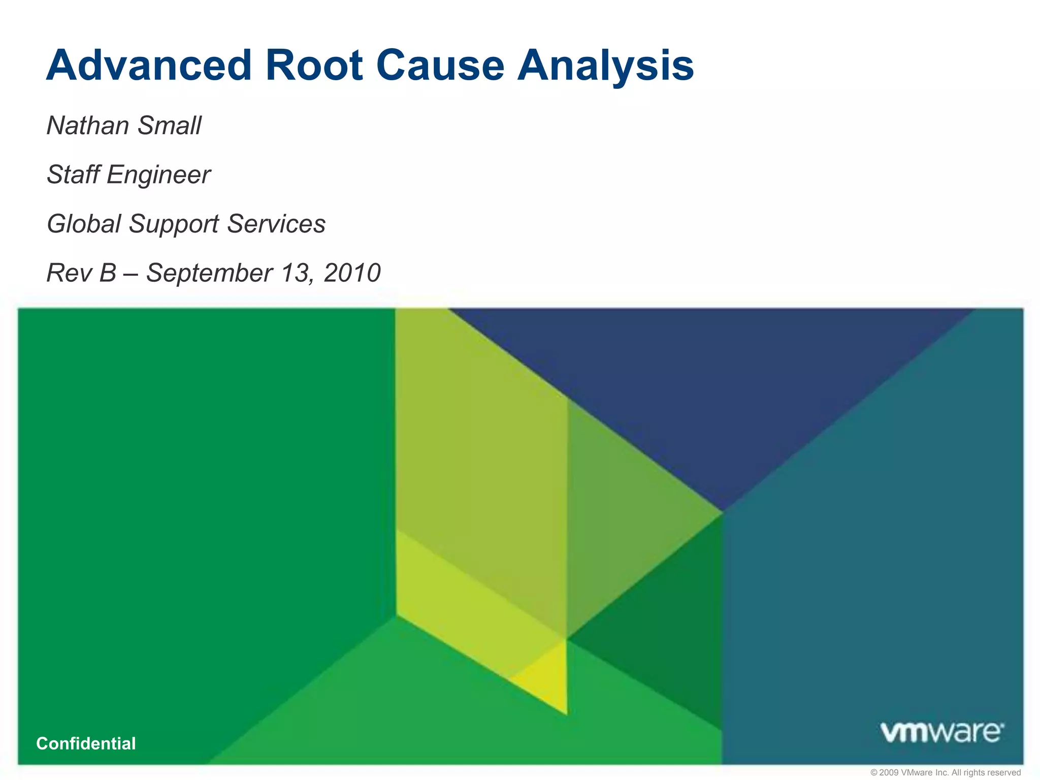 The document provides detailed information on advanced root cause analysis techniques in VMware environments, focusing on various logging mechanisms such as vmkernel, hostd, and vpxa logging. It explains how to enhance logging levels for HBA drivers, set up serial line logging or remote syslog for missing logs, and crash a VM or ESX host to capture memory dumps for troubleshooting. Additionally, instructions for managing and interpreting logs related to system corruption are included.