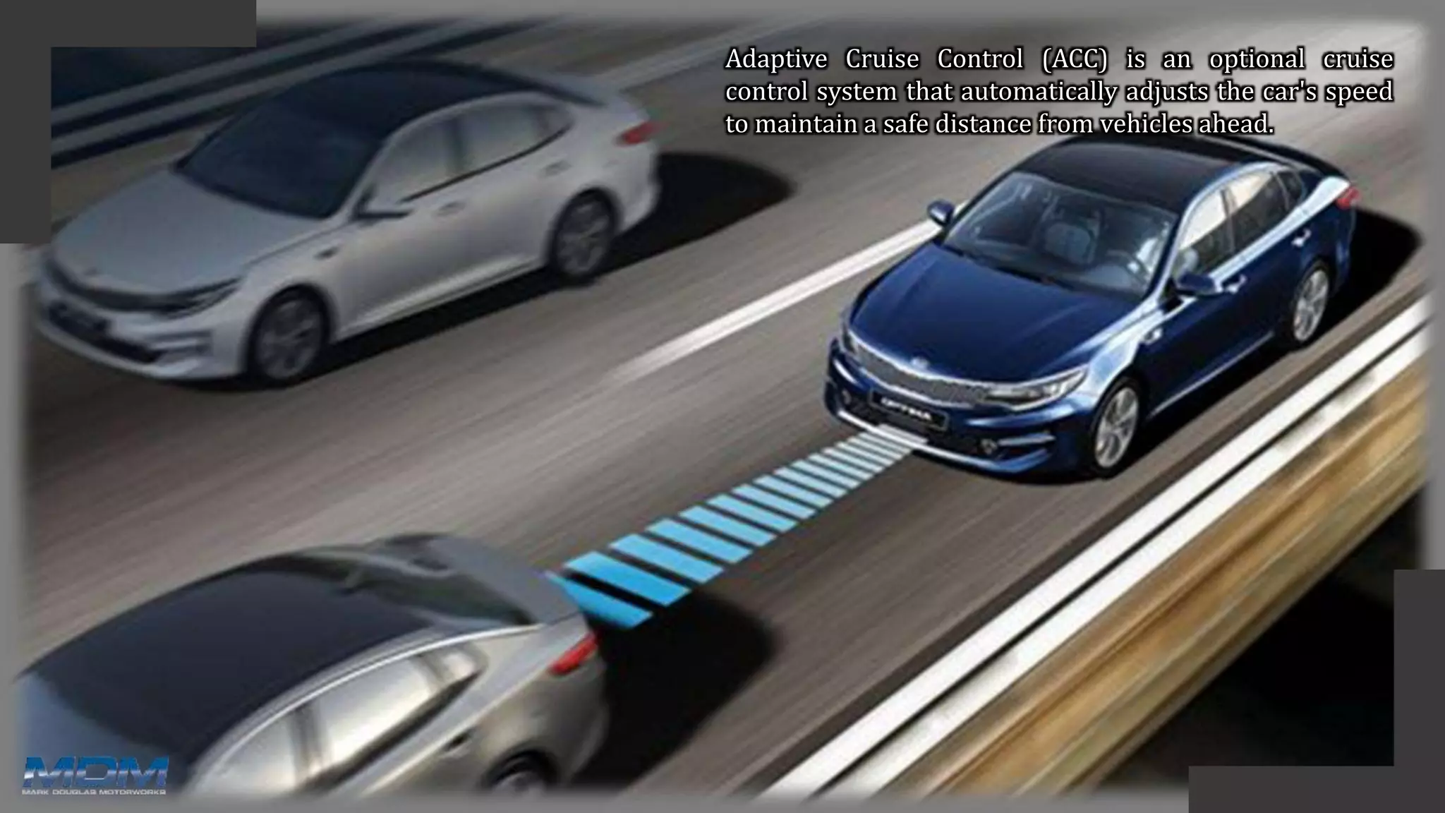 Adaptive cruise control (ACC) is an optional feature that automatically adjusts a vehicle's speed to maintain a safe distance from cars ahead, with advanced versions able to stop in traffic jams. It relies on sensors like radar and cameras, but does not replace traditional brakes and is not standardized among manufacturers. Users must ensure the system's sensors are clear and be cautious in adverse weather or conditions where ACC may not function properly.