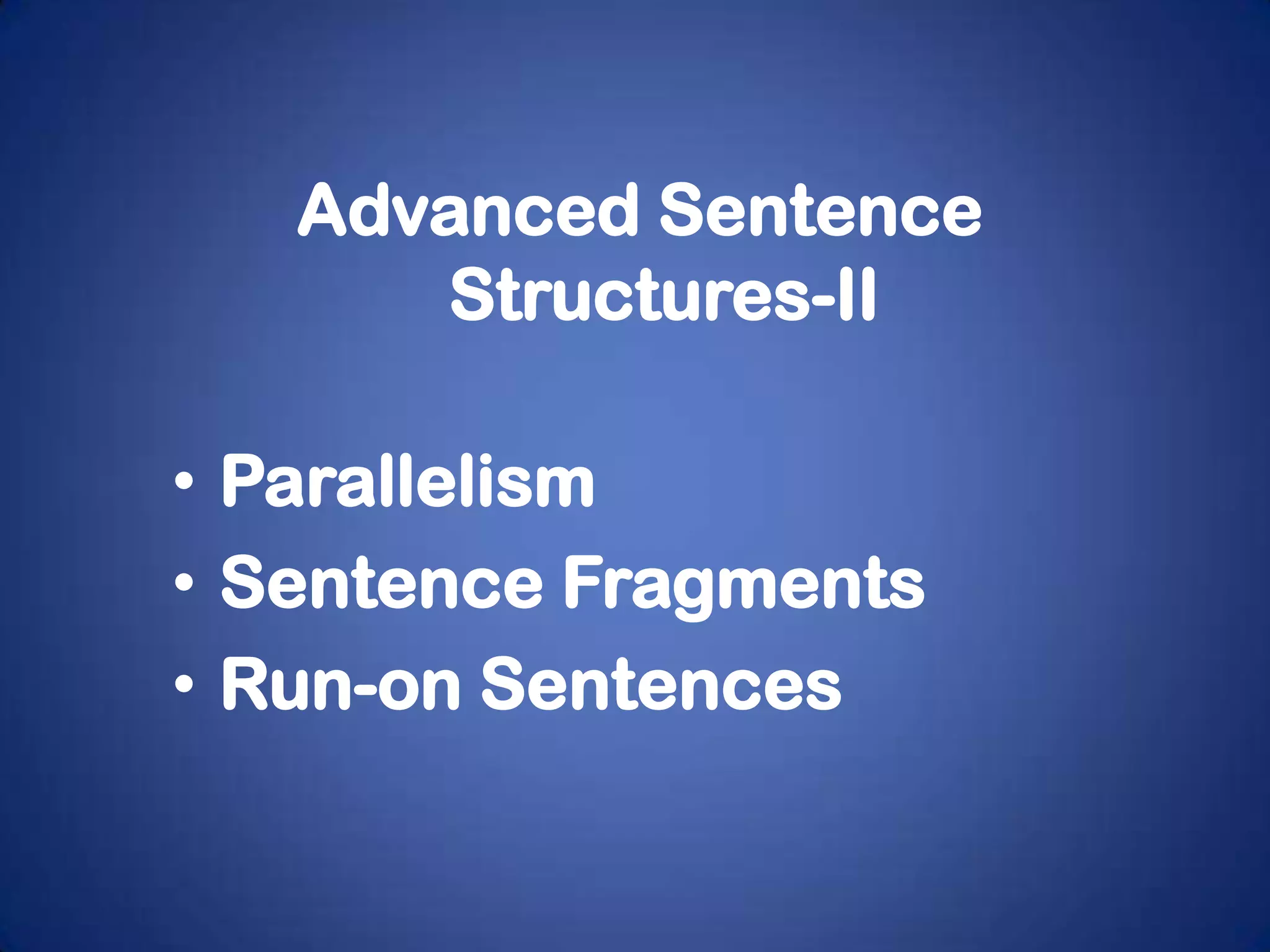 This document discusses advanced sentence structures, including parallelism, sentence fragments, and run-on sentences. It provides examples and activities to identify these structures. Parallel structure means using similar grammatical forms to connect two or more elements in a sentence. Sentence fragments are incomplete sentences that are missing a subject, verb, or both. Run-on sentences contain two or more complete sentences joined without proper punctuation or conjunctions.