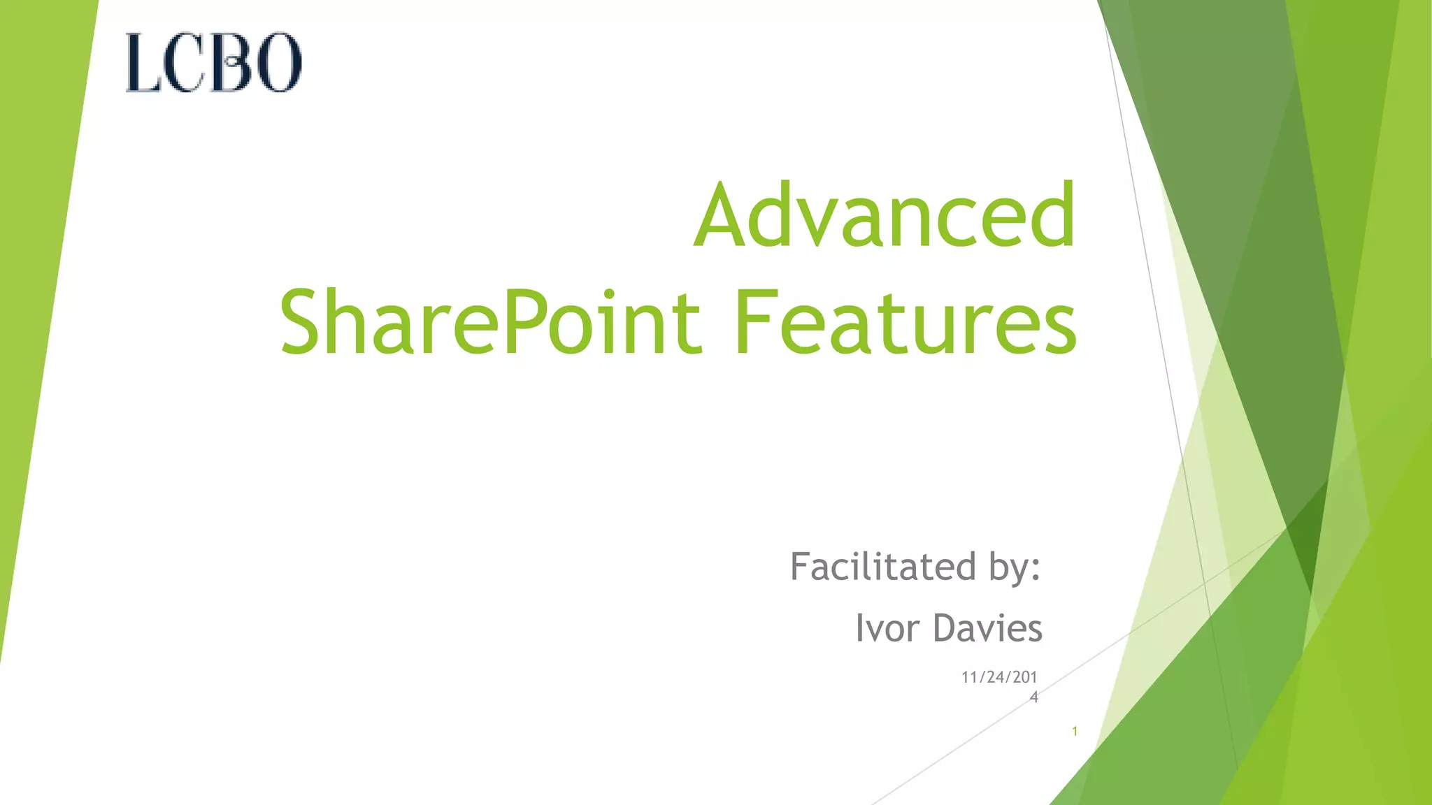 This document summarizes an advanced SharePoint features training session facilitated by Ivor Davies. The agenda covers working with SharePoint lists and forms using InfoPath 2010, as well as Excel Services, Visio Services, slide libraries, picture libraries, surveys, and SharePoint workspaces. The document provides an overview of these features and how they can be used to enable collaboration within teams. Examples of existing forms in use are also listed. Resources for further learning about InfoPath and SharePoint are included.