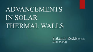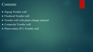 This document discusses advancements in solar thermal walls, including zigzag Trombe walls, fluidized Trombe walls, Trombe walls with phase-change materials, composite Trombe walls, and photovoltaic Trombe walls. Zigzag Trombe walls reduce heat gain and glare using an inward V-shape. Fluidized Trombe walls improve heat transfer through a fluidized bed. Trombe walls with phase-change materials store more latent heat in a smaller space. Composite Trombe walls control heating rates and provide high insulation. Photovoltaic Trombe walls increase electrical efficiency by removing heat from photovoltaic panels.