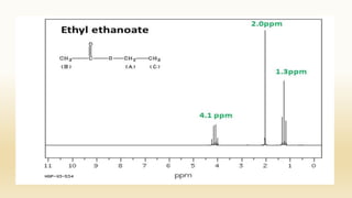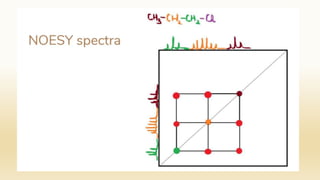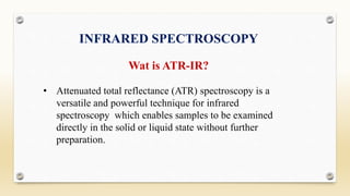 The document discusses techniques for interpreting organic compounds using infrared (IR), nuclear magnetic resonance (NMR), and mass spectrometry. It elaborates on attenuated total reflectance (ATR) as a method for analyzing samples in various states without preparation and highlights various applications in the pharmaceutical and chemical industries. Additionally, it outlines the noesy technique in NMR for determining the proximity of protons and explains the ring rule for calculating unsaturation in organic compounds.