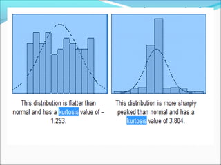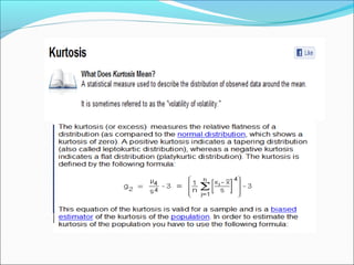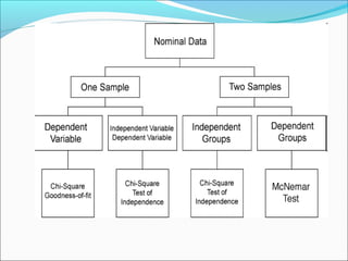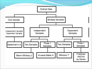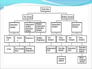 This document outlines topics related to statistics that will be covered. It is divided into 6 parts. Part 1 discusses the role of statistics in research, descriptive statistics, sampling procedures, sample size, and inferential statistics. Part 2 covers choice of statistical tests, defining variables, scales of measurements, and number of samples. Parts 3 and 4 discuss parametric and non-parametric tests. Part 5 is about goodness of fit tests. Part 6 covers choosing correct statistical tests and introduction to multiple regression. The document also provides examples and definitions of key statistical concepts like mean, median, mode, range, and different sampling methods.