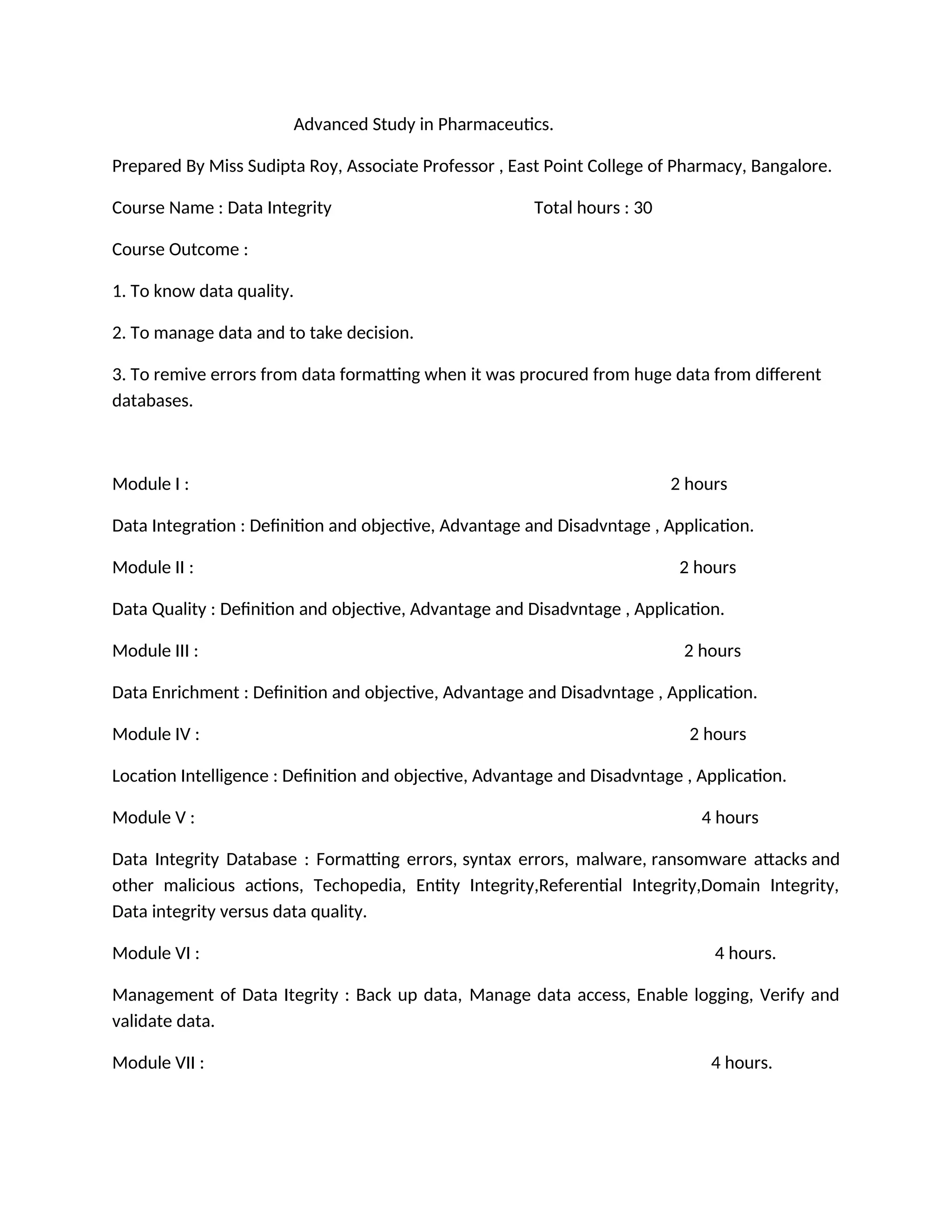 The document outlines a 30-hour advanced course in data integrity, prepared by Miss Sudipta Roy at East Point College of Pharmacy. It covers various modules including data integration, quality, enrichment, location intelligence, integrity management, security, and types of data integrity. The course aims to educate participants on ensuring data quality, managing data effectively, and improving decision-making while addressing errors and risks associated with data.