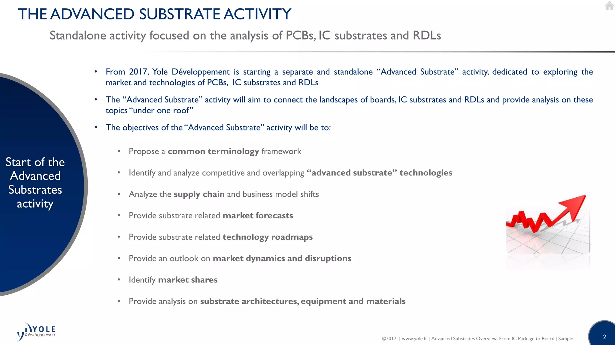 The document introduces an 'advanced substrate' activity by Yole Développement, focusing on the analysis of printed circuit boards (PCBs), integrated circuit (IC) substrates, and redistribution layers (RDLs) to better understand market dynamics and technology trends. This first report outlines objectives including market forecasts, supply chain analysis, and competitive technology identification, aimed at fostering integration and understanding within this evolving sector. Key drivers for advanced substrates are identified as the ongoing scaling of semiconductor technologies and the diversification of applications, particularly influenced by advancements in mobile devices and the Internet of Things (IoT).