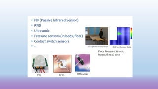 3) Activity recognition algorithms that can analyze sensor data to recognize behaviors and patterns. Both ambient and vision-based approaches are described.