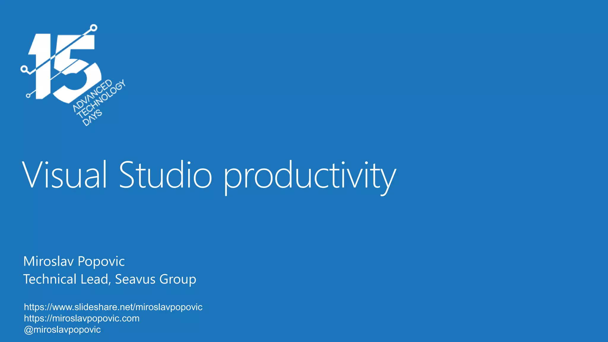 The document outlines various productivity features of Visual Studio, highlighting tools and capabilities such as code editing, analysis, and navigation. It also mentions extensions that enhance the development experience, including Visual Studio Live Share and Web Essentials. Additionally, there are links to demo applications and resources for further exploration of these features.
