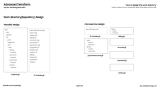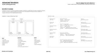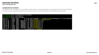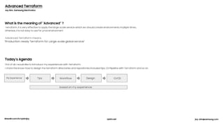 This document contains notes from a talk on advanced Terraform techniques. It discusses using Terraform for infrastructure as code to deploy resources across multiple environments like development, staging, and production. It also mentions techniques like separating code into modules, using variables to parameterize configurations, and integrating Terraform with other DevOps tools like Ansible.