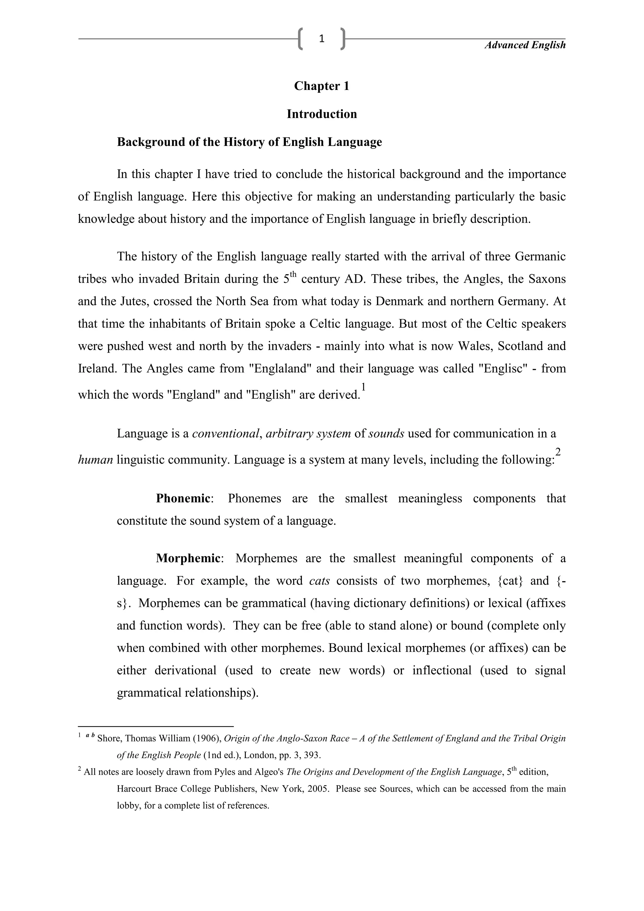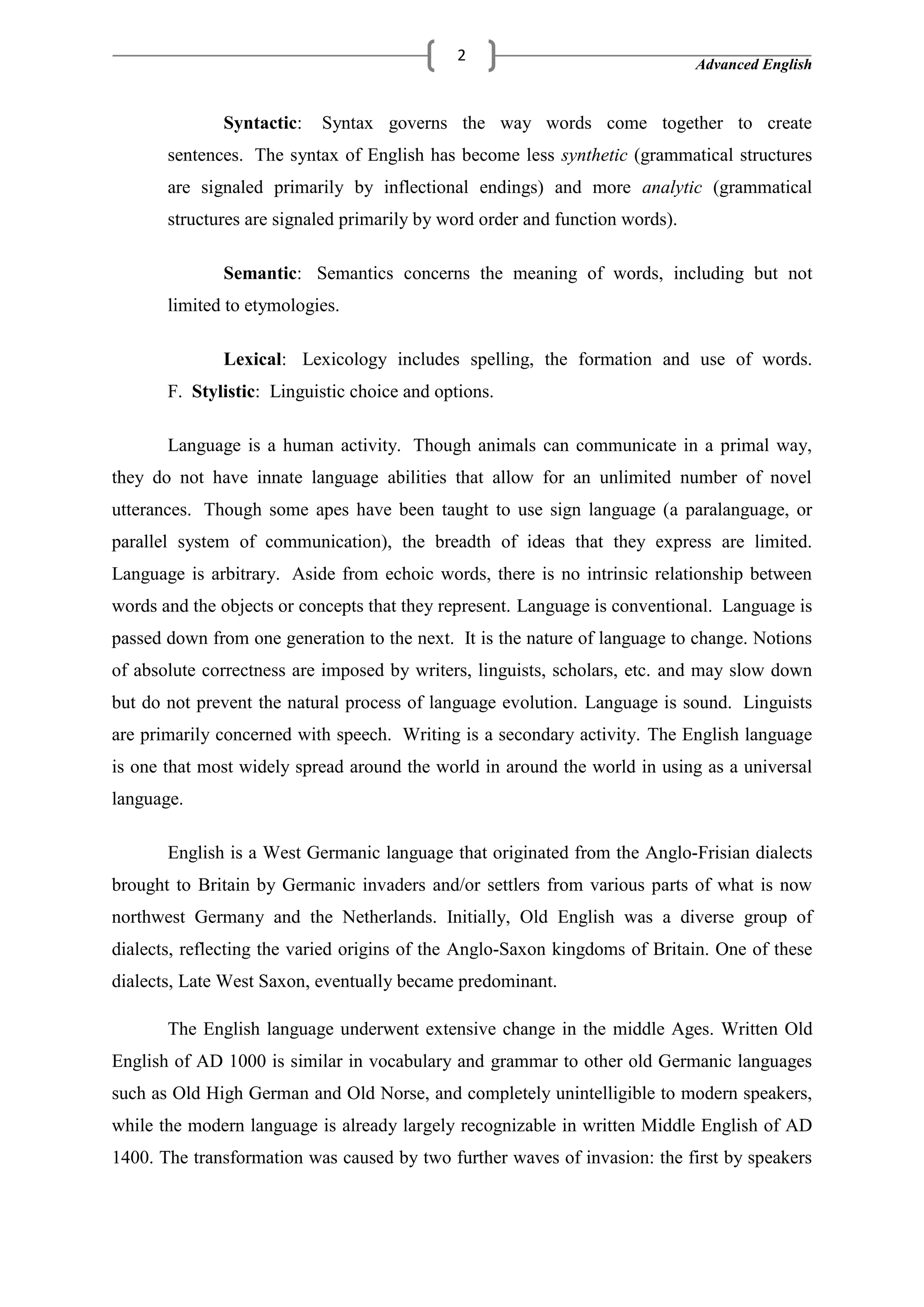 The document provides an overview of the history and structure of the English language. It discusses how English originated from Germanic tribes invading Britain and displacing Celtic languages. It then covers the basic structures of English sentences, including the subject-verb relationship and how additional elements like objects, adjectives, adverbs and nouns can be added. Finally, it examines the spread and importance of English as a global language today due to British colonialism and American cultural influence.