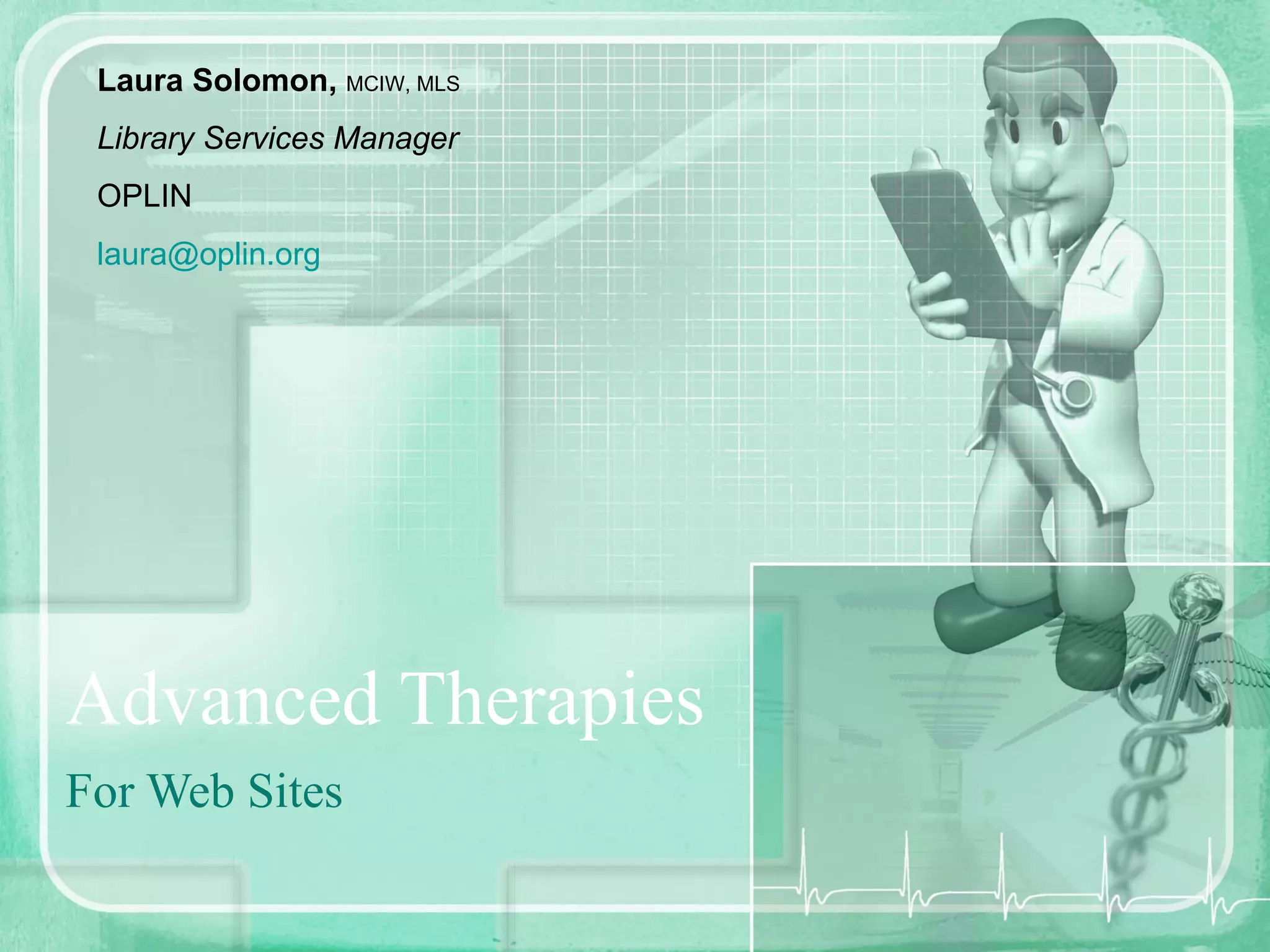 ![Advanced Therapies For Web Sites Laura Solomon, MCIW, MLS Library Services Manager OPLIN [email_address]](https://image.slidesharecdn.com/advancedtherapies-090406082857-phpapp02/75/Advanced-Therapies-for-Library-Web-Sites-OPLIN-1-2048.jpg)