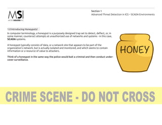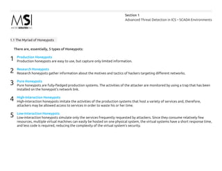The document discusses the use of honeypots for advanced threat detection in ICS and SCADA environments, detailing different types of honeypots and their functionalities, such as production, research, and high versus low interaction. It also outlines the advantages and challenges of implementing honeypots, emphasizing their role in enhancing visibility, intelligence gathering, and decision-making in cybersecurity. Lastly, it presents a maturity model for honeypot deployment and includes case studies illustrating their effectiveness in identifying unauthorized access and vulnerabilities.