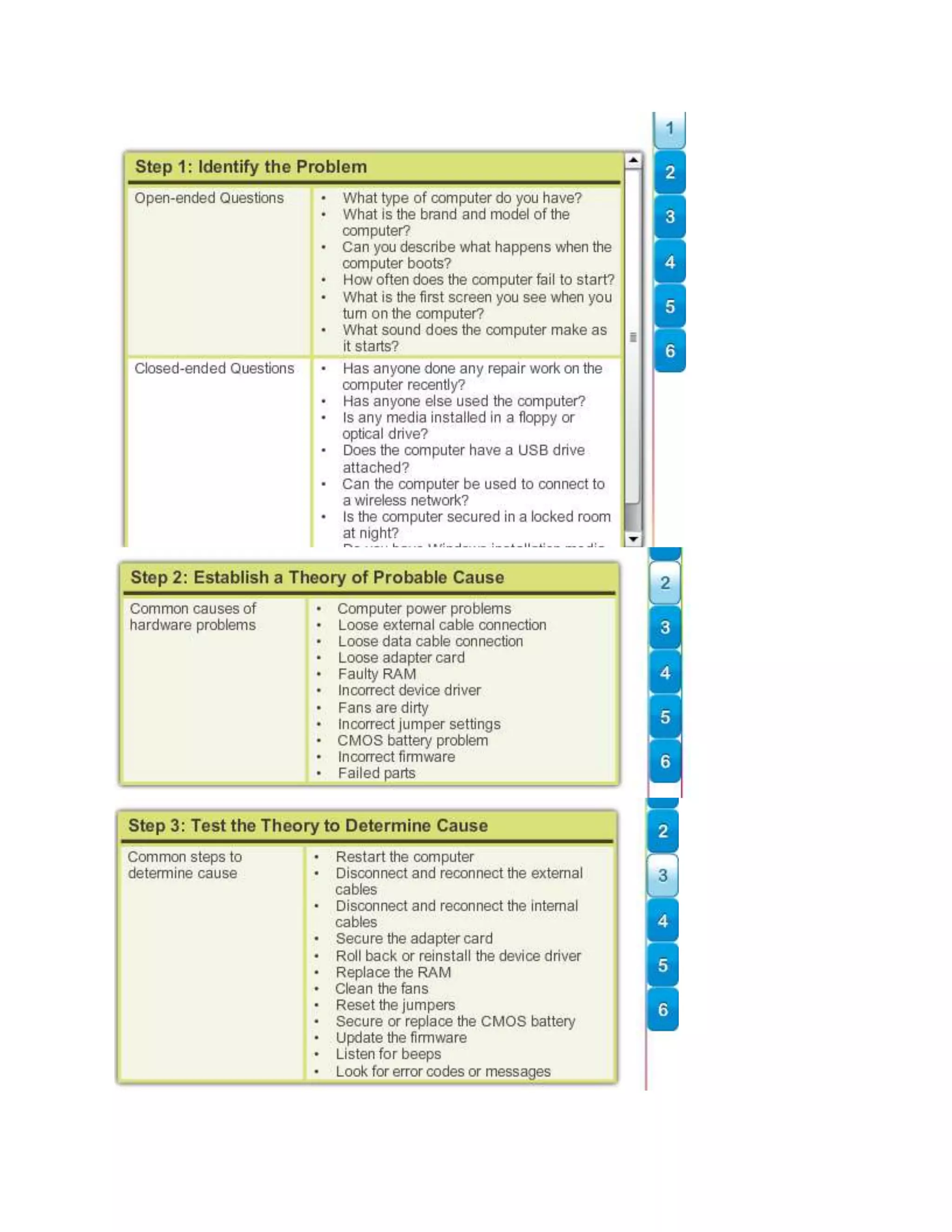 This document discusses advanced troubleshooting techniques for computer technicians. Advanced troubleshooting requires strong diagnostic skills for hardware, software, networks, as well as strong communication skills when working with customers and other technicians. The document emphasizes using all available resources, including other technicians, to diagnose and solve problems, as well as helping other technicians when able. It also notes that advanced troubleshooting may involve unique problems or solutions that are difficult to perform or diagnose.