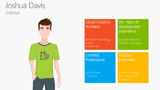 The document describes a Cloud Solutions Architect with over 25 years of development experience across multiple platforms and languages, and includes links to personal blogs and social media profiles. It discusses various technical concepts including memory management, performance, dependency injection, and data handling practices. Additionally, it highlights asynchronous database connectivity and provides a reference to JavaScript module patterns.
