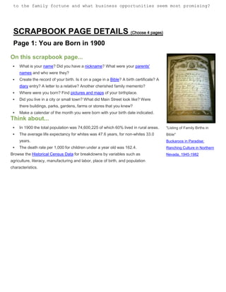 This document provides instructions for a student project to create a scrapbook from the perspective of a child living between 1900-1912. Students are to choose 4 pages from topics including their birth, education experiences, holidays, travel, and life during a period of technological change. Each page requires images and writing to depict different aspects of life as a child at the turn of the 20th century.