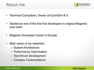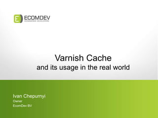 Ivan Chepurnyi discussed Varnish Cache and its usage in Magento. Varnish is a frontend caching proxy that caches static and dynamic content to improve site performance. It works by caching responses from the backend server and delivering cached responses to subsequent requests when possible. Ivan described how to use the EcomDev_Varnish module to implement dynamic content, custom caching rules, and automatic cache clearing in Magento with Varnish. He also compared Varnish to Magento's built-in full page cache and outlined his open source roadmap for 2014.