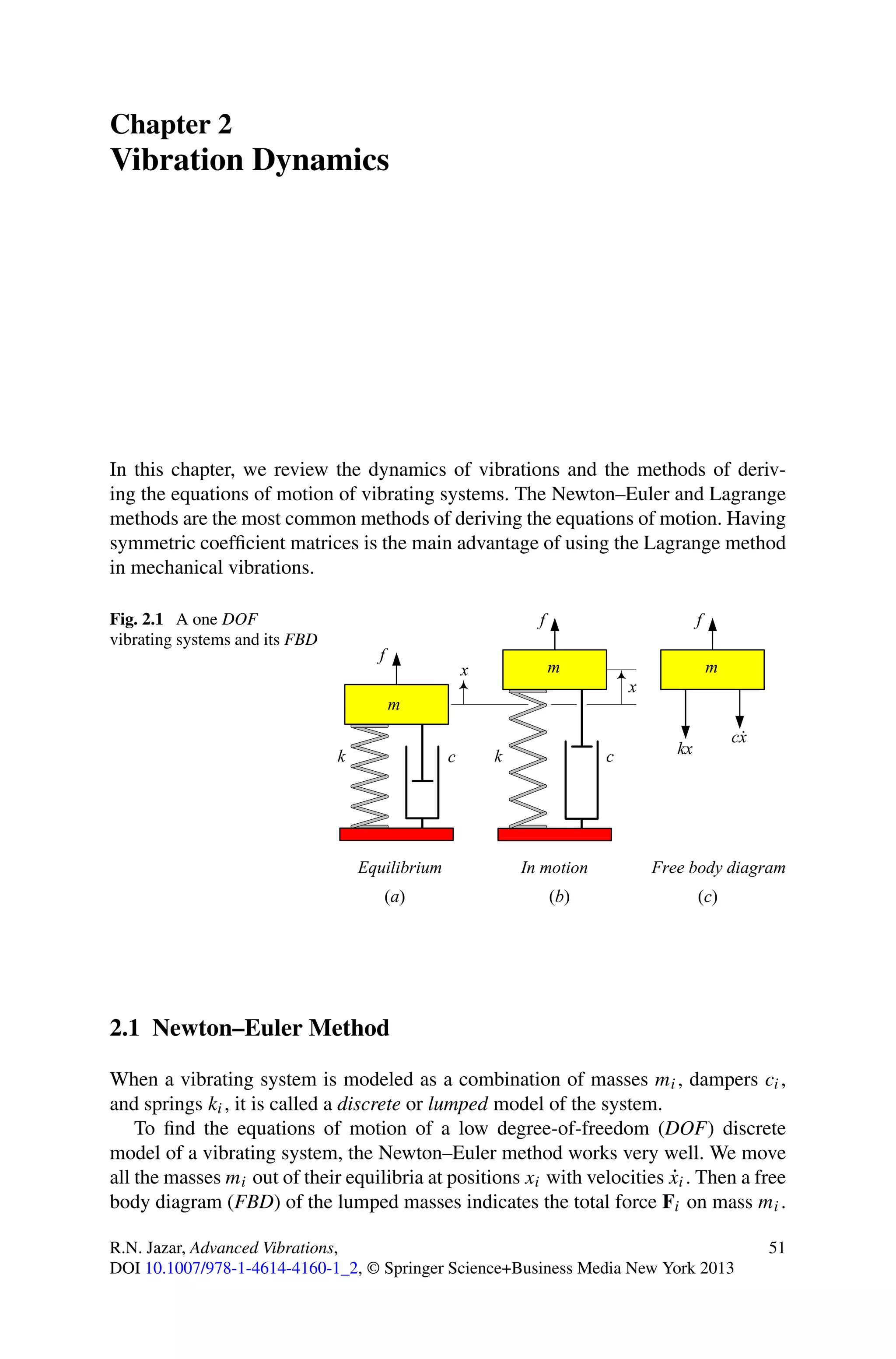 This chapter discusses vibration dynamics and methods for deriving equations of motion. The Newton-Euler and Lagrange methods are commonly used to derive equations of motion for vibrating systems. The Newton-Euler method is well-suited for discrete, lumped parameter models with a low degree of freedom. It involves drawing free body diagrams and applying Newton's second law to each mass to obtain the equations of motion. Having symmetric coefficient matrices is the main advantage of using the Lagrange method for mechanical vibrations.
