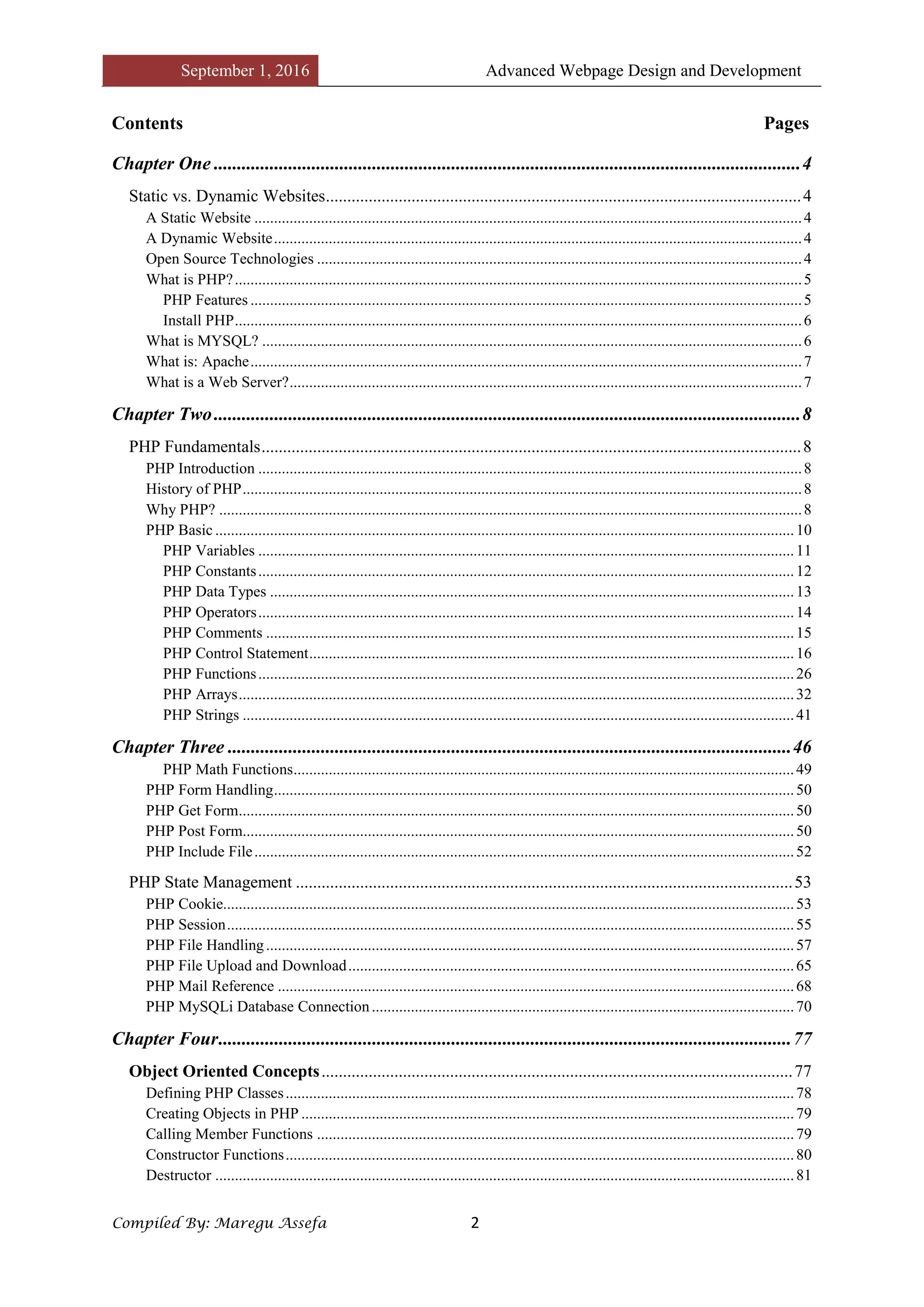 The document is a comprehensive guide on advanced webpage design and development, focusing on PHP programming. It covers topics such as the differences between static and dynamic websites, PHP fundamentals, its features, installation, as well as the functionality of MySQL and Apache. The content is organized into chapters detailing PHP's history, syntax, data types, and advanced concepts like object-oriented programming.