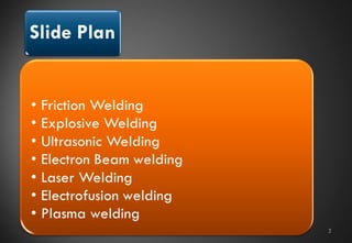 The document discusses several welding techniques including explosive welding, ultrasonic welding, electron beam welding, laser beam welding, electrofusion, and plasma arc welding. Explosive welding uses detonation to join metals by forcing them together at high speed. Ultrasonic welding uses high frequency vibrations to create solid-state welds without other joining methods. Electron beam and laser beam welding use focused beams of electrons or laser light to melt materials together. Electrofusion uses electric heating elements in plastic pipe fittings to melt and fuse pipes. Plasma arc welding uses an ionized gas to generate an arc between an electrode and workpiece to produce welding heat.