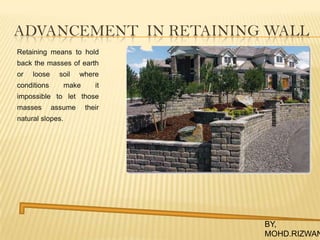 This document provides information on various retaining wall technologies. It discusses gravity walls, crib walls, gabion walls, cantilever walls, sheet pile walls, and types of materials that can be used for retaining walls like wood, steel, concrete. It also summarizes different retaining wall systems like MSE walls, precast panel walls, counterfort walls, modular block walls, and vegetated soil bioengineering systems. The document highlights the advantages of each technology which include fast construction, flexibility, durability, and cost-effectiveness.