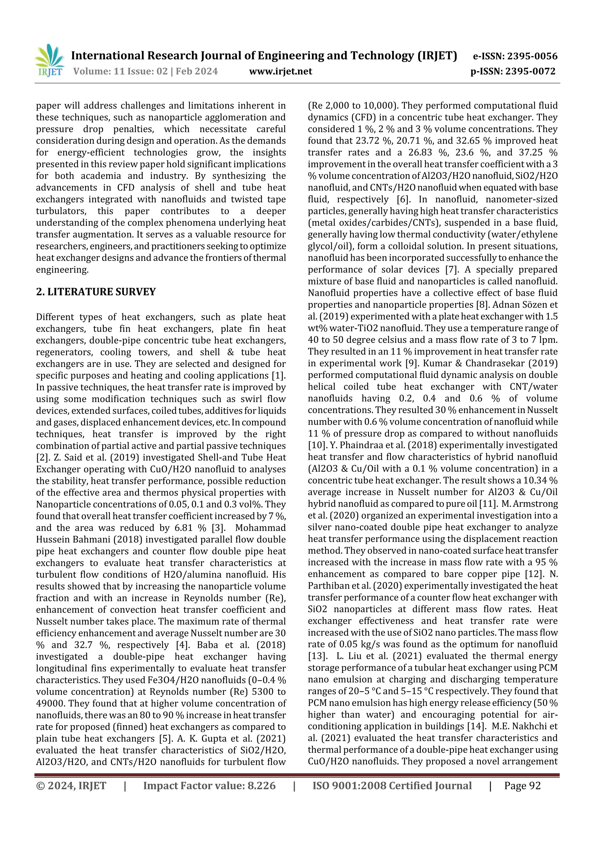 The document reviews advancements in computational fluid dynamics (CFD) analysis of shell and tube heat exchangers utilizing nanofluids and twisted tape turbulators to enhance heat transfer efficiency. It highlights the potential of nanofluids to improve thermal conductivity and the role of twisted tape in altering flow dynamics, while addressing challenges like nanoparticle agglomeration and increased pressure drop. The findings illustrate the synergy of these technologies, presenting insights for optimizing heat exchanger designs in various industrial applications.