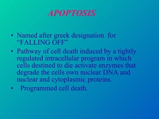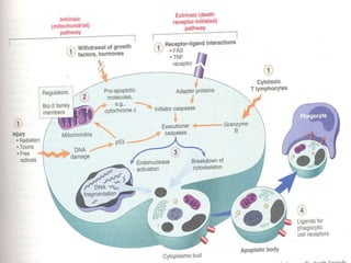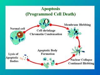 1. Apoptosis is a tightly regulated form of programmed cell death that plays an important role in development, tissue homeostasis, and the immune system. It is characterized by morphological changes including cell shrinkage, chromatin condensation, and formation of apoptotic bodies.