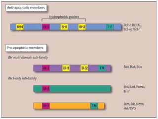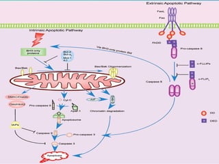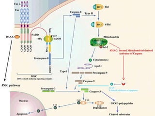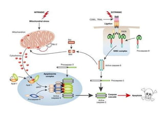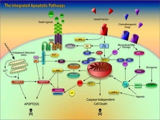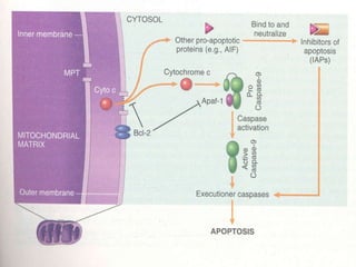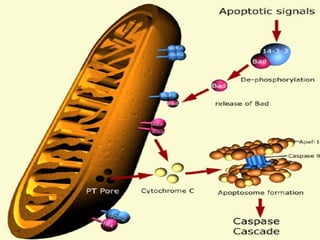 2. The process of apoptosis involves initiator caspases that activate executioner caspases, leading to degradation of nuclear and cytoplasmic components. Mitochondria also play a key role by releasing pro-apoptotic factors. Various proteins regulate apoptosis, including Bcl-2 family members and inhibitors of apoptosis (IAPs).