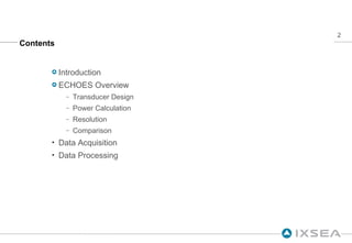 The document presents advances in geophysical sensor data acquisition, specifically focusing on IXSEA's range of sub-bottom profilers known as 'echoes'. It discusses the technical specifications of various models, including transducer designs, acoustic power outputs, and performance metrics like resolution and bandwidth. Additionally, it highlights the Delph software for seismic acquisition and processing, emphasizing a simplified approach to ensure data integrity during acquisition.