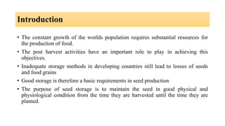 The document discusses various advances in seed storage methods. It notes that proper storage is important to maintain seed quality until planting. Methods discussed include drying seeds to safe moisture levels, using structurally sound storage structures in cool areas, hermetic bags, metal bins, treated jute and paper bags, and modern fumigation techniques using gases like methyl bromide to kill insects in stored seeds and grains. Good storage practices involve cleaning, pest control, and regular inspection and treatment if needed.