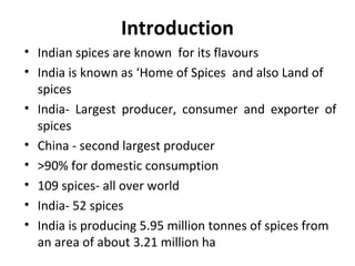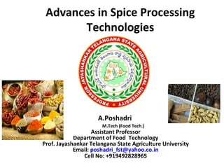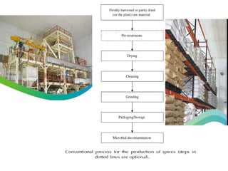 This document discusses advances in spice processing technologies in India. It provides an overview of India's dominance in spice production and trade globally. It then discusses various processing techniques for spices including sterilization methods like fumigation with ethylene oxide, irradiation, steam treatments and high hydrostatic pressure to reduce microbial loads. It also discusses grinding and milling of spices, production of spice oleoresins and essential oils, and applications of processed spices in culinary products and seasonings. Both advantages and disadvantages of different processing methods are highlighted.