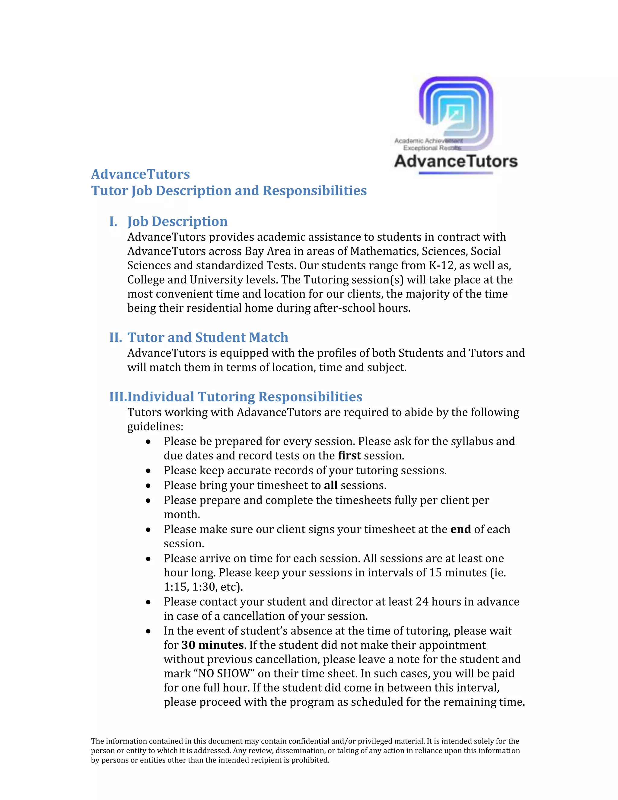This document outlines the job description and responsibilities for tutors working with AdvanceTutors. It details that tutoring sessions will take place in students' homes and tutors are expected to be prepared, on time, keep accurate records, contact students in the event of a cancellation, dress professionally, and submit timesheets by the end of each month for payment processing. Tutors are independent contractors responsible for their own taxes and benefits.