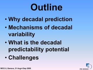 The document discusses the importance of decadal climate prediction, highlighting mechanisms of decadal variability and the challenges faced in achieving accurate forecasts. It emphasizes the potential for predictability in surface air temperature and the need for improved climate observation systems and modeling methods. Key topics include the influence of internal variability, boundary conditions, and the necessity for a coordinated scientific program to enhance decadal predictability.