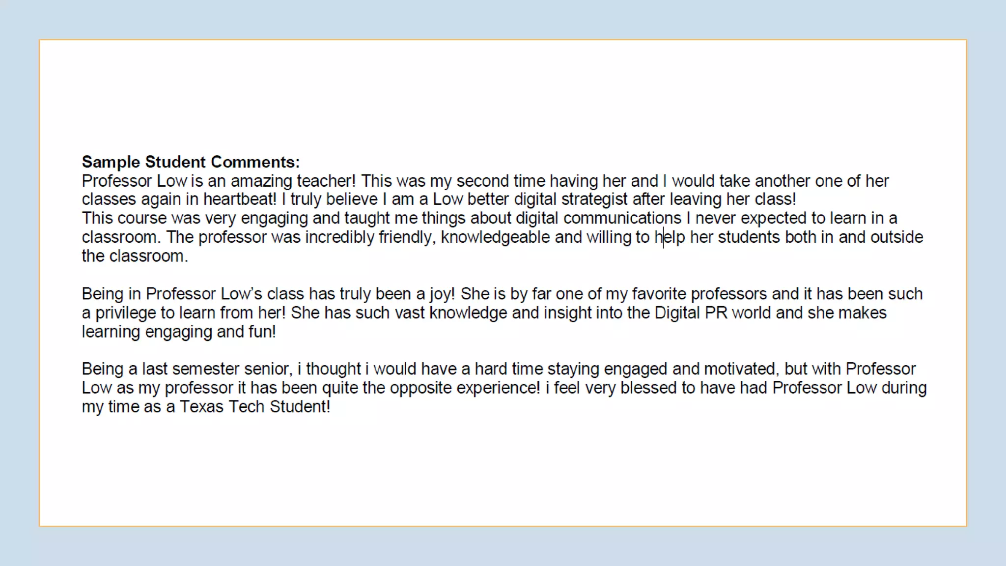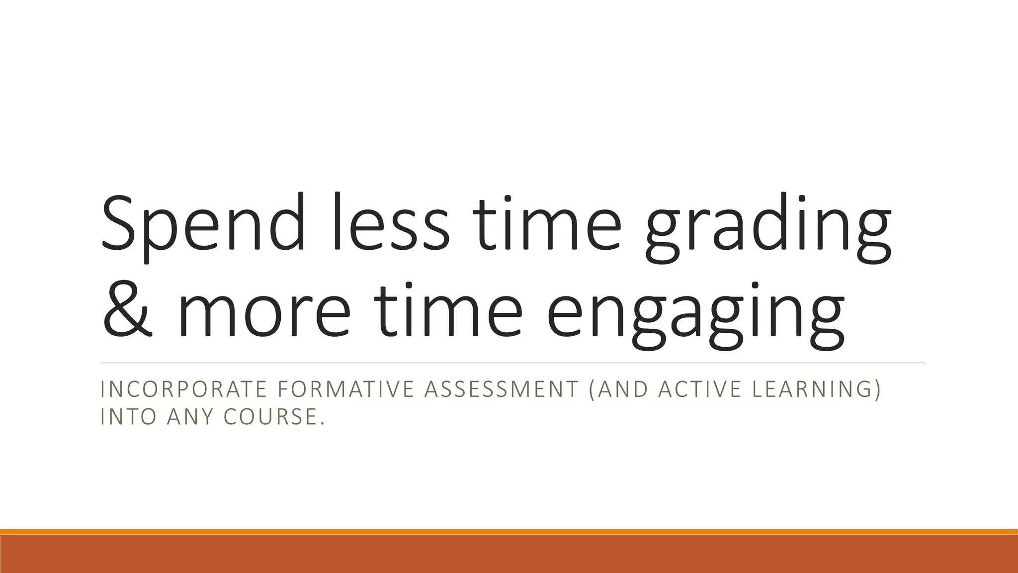 This document discusses incorporating formative assessment and active learning into courses to spend less time grading and more time engaging with students. It recommends using formative assessment techniques like Padlet and Kahoot to get students more actively involved in class. These techniques make material more accessible and build student confidence by removing barriers. Formative assessments help identify concepts students are struggling with so teachers can adjust their lessons and instruction. This leads to improved student evaluations and makes teaching more enjoyable.