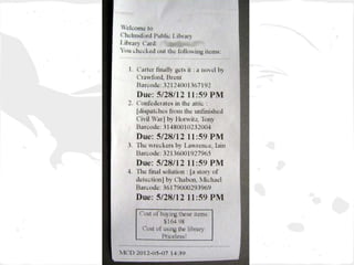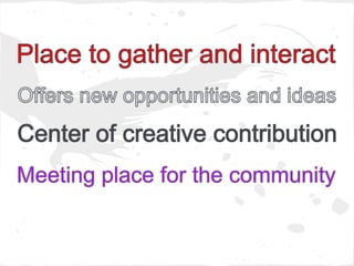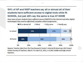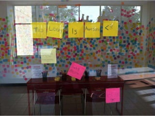 The document discusses how libraries are evolving to enhance user experiences and adapt to technological changes in education and community needs. It highlights the disparity in resources between teachers in higher and lower-income areas, the extensive use of technology by teachers, and how libraries are reimagining their roles with a focus on customer service and collaboration. Several case studies, including Anythink Libraries and Oak Park Public Library, illustrate innovative practices and the importance of participatory approaches in engaging with the community.