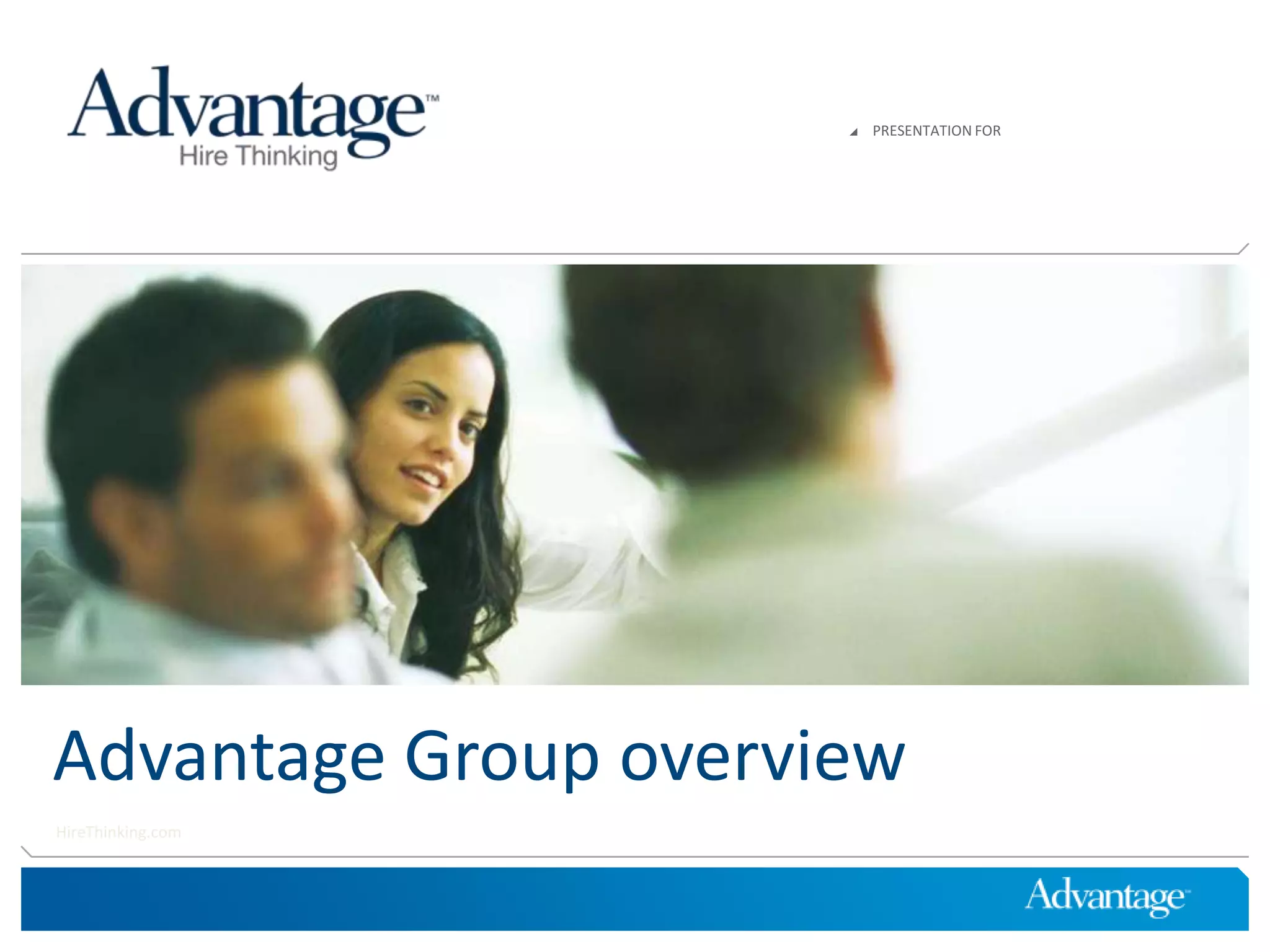 The Advantage Group is a global recruitment company with over 4,000 employees and 350 offices worldwide. It has annual revenues over £3 billion and specializes in temporary staffing, direct hiring, outsourcing, and recruiting over 145,000 professionals annually. The company has four business groups that allow it to efficiently allocate resources across industries and geographies.