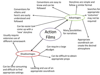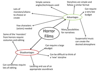 This document compares different genres of filmmaking and outlines their common advantages and disadvantages. Horror, action, romance, drama and adventure films typically have simple storylines and require few actors. They benefit from effective use of music but may require extensive editing, costumes or large budgets. Comedy, thriller and other genres also share conventions but can be challenging to make unique or find willing actors and locations. Overall, the document provides an overview of film genre fundamentals and production considerations.