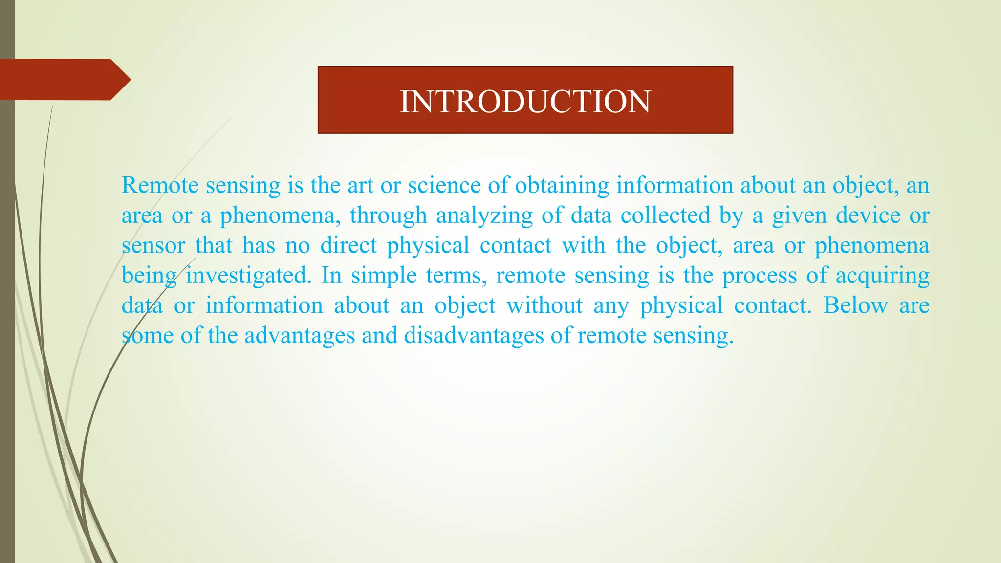 Remote sensing allows for coverage of large areas from a distance without direct contact. It has advantages like monitoring wide regions, repetitive coverage, multi-scale data collection, and efficient analysis. However, it also has disadvantages like high costs for small-scale analysis, need for trained analysts, risk of human errors, and potential incompleteness of information collected. Remote sensing is generally best for regional surveys but may not be suitable for all applications or scales.
