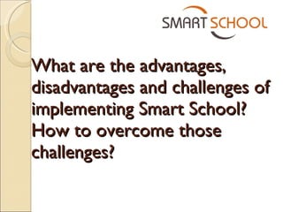 The document discusses the advantages, disadvantages, and challenges of implementing Smart Schools. Some key advantages are improved interactive learning, access to the latest technology, and more flexible curriculums. Challenges include the high costs, lack of infrastructure in rural areas, and limited internet connectivity. Methods to overcome the challenges include using more effective teaching materials, increasing public awareness of Smart Schools, and providing rigorous training to teachers on technology and new skills.