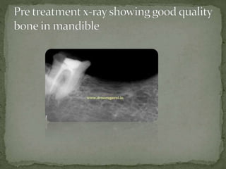 The document discusses the benefits of using basal compressive implants for patients with missing molars, particularly in situations where previous teeth have been lost. These implants can be placed using a nonsurgical technique and offer advantages such as immediate teeth fixing, reduced risk of screw loosening, and increased strength compared to two-piece implants. Additionally, they are suitable for diabetics and smokers due to a lower risk of infection.