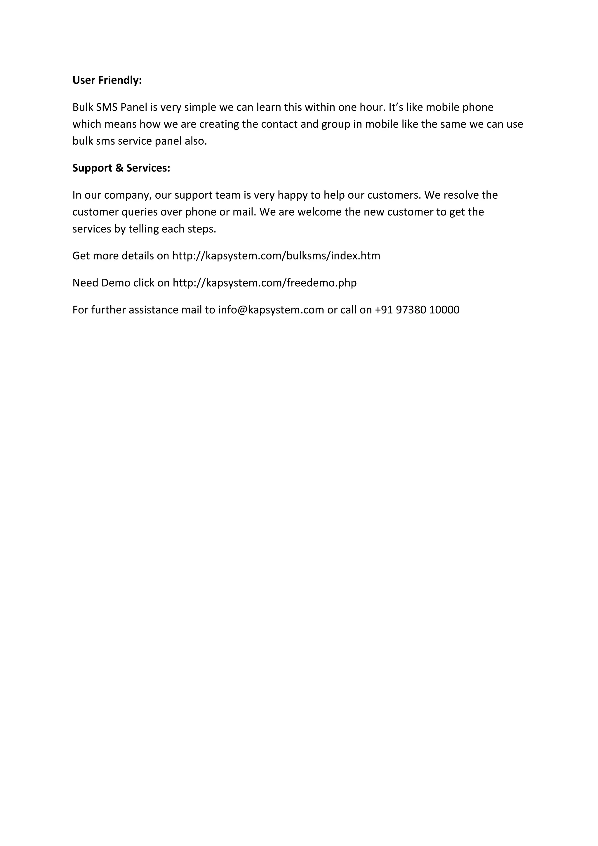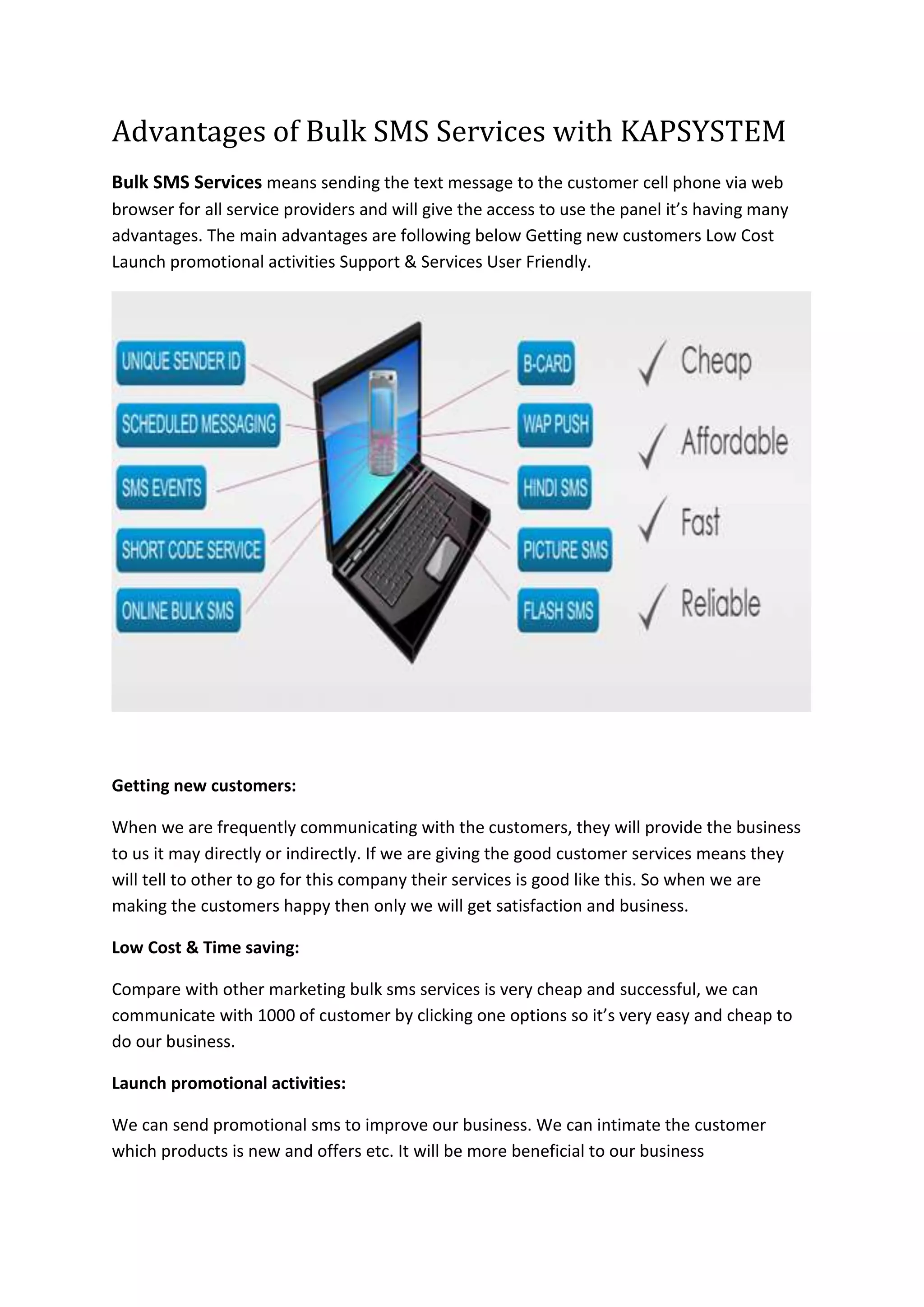 Bulk SMS services allow sending text messages to many customers at once through a web interface. The main advantages are getting new customers through frequent, quality communication; low costs and time savings compared to other marketing; launching promotional activities like new product or sales notifications; an easy-to-use, intuitive interface similar to messaging on a mobile phone; and responsive customer support.