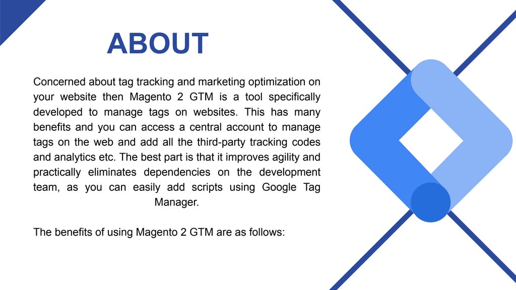 Concerned about tag tracking and marketing optimization on your website then Magento 2 GTM is a tool specifically developed to manage tags on websites. This has many benefits and you can access a central account to manage tags on the web and add all the third-party tracking codes and analytics etc. The best part is that it improves agility and practically eliminates dependencies on the development team, as you can easily add scripts using Google Tag Manager.