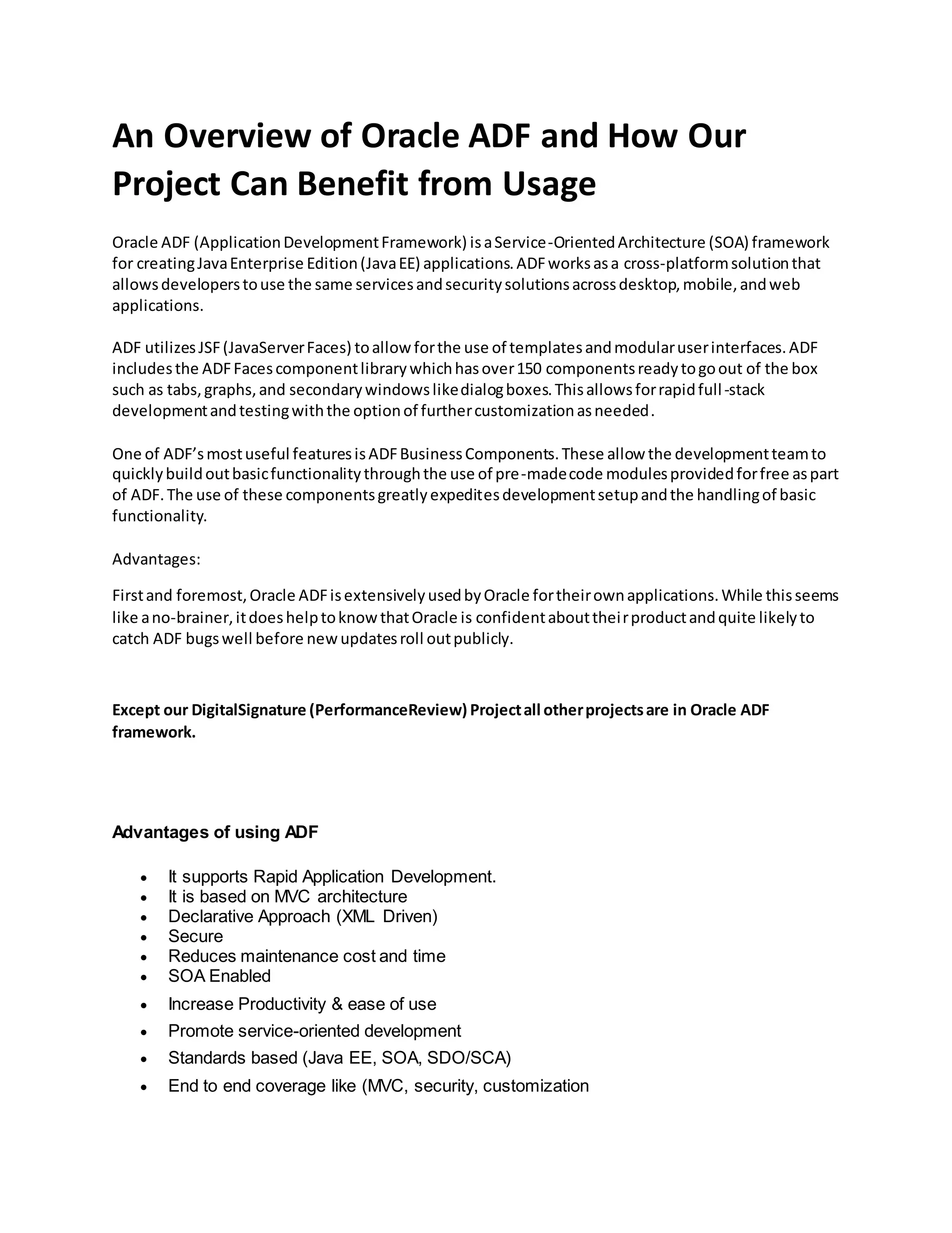 Oracle ADF is a service-oriented framework that allows developers to create Java EE applications across desktop, mobile, and web using the same services and security solutions. ADF utilizes JSF to allow for modular user interfaces using over 150 ready-to-use components. One of its most useful features is ADF Business Components, which provide pre-made code modules that greatly expedite development setup and handling of basic functionality. Using ADF advantages our project by providing a robust and maintainable application based on standards with increased productivity.
